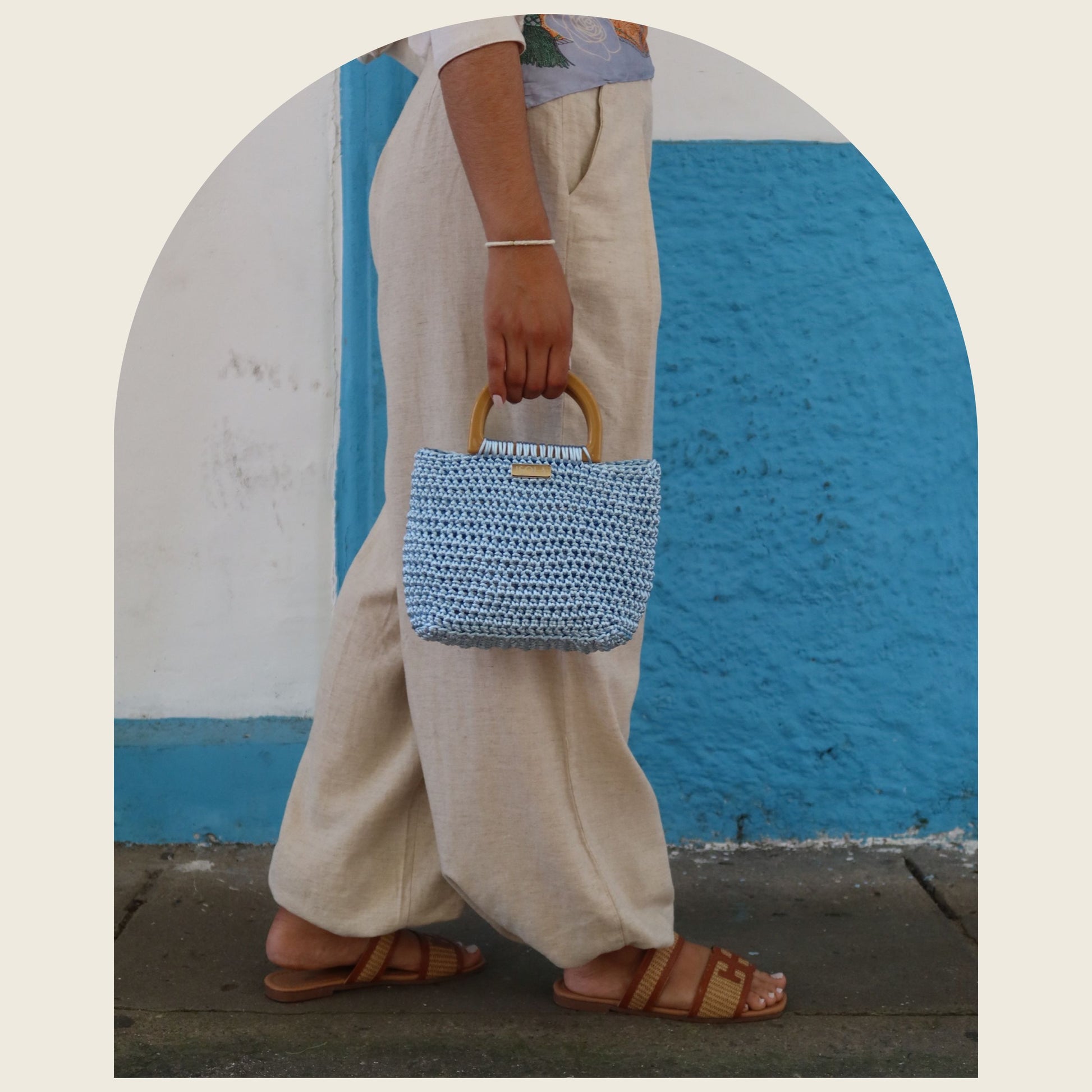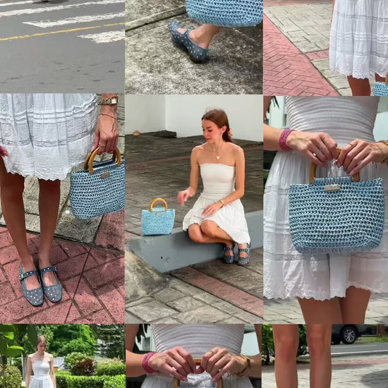 Your endless summer essential. Tejida a mano con hilos satinados en un suave Capri blue tone, esta pieza combina timeless sophistication con un aire resort chic. Su silueta estructurada y asas rígidas le dan un acabado elegante, mientras la plaquita distintiva de ISOLA aporta ese signature touch que la convierte en un statement must-have. Perfecta para llevarla from seaside brunches to city strolls, es el accesorio que eleva cualquier look con un luxury coastal vibe.
